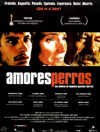 SINOPSIS: Ciudad de México en el amanecer de un nuevo siglo. Un terrible accidente automovilístico se convierte en el punto de encuentro de tres "amores perros". Octavio, un joven adolescente enamorado de su cuñada, ha transformado a su perro "Cofi" en una mortífera arma con la que desea escapar de su miseria amorosa. Valeria, una hermosa modelo, ve truncada su carrera y su nueva vida al lado de Daniel, mientras su pequeño perro "Richi" queda atrapado, como ella, en los estrechos límites de su departamento. Por su parte el taciturno Chivo, un ex-guerrillero que no puede acercarse a la hija que algún día abandonó, sublima su necesidad de amor recogiendo perros en la calle. Ninguno de ellos volverá a ser el mismo después del accidente. Todos, incluyendo a los perros, encontrarán un destino muy distinto al que algún día imaginaron.